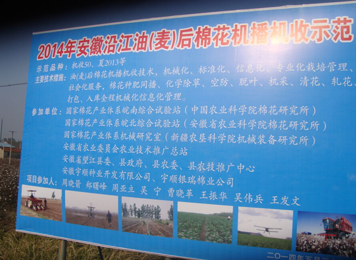 由中國(guó)農(nóng)業(yè)科學(xué)院棉花研究所、安徽省農(nóng)業(yè)科學(xué)院棉花研究所、安徽宇順?lè)N業(yè)開(kāi)發(fā)有限公司聯(lián)合在安慶布點(diǎn)示范的2014年安徽沿江油(麥)后棉花免耕直播機(jī)收示范取得圓滿成功!2014年11月6日—7日,分別在安徽省農(nóng)業(yè)科學(xué)院棉花研究所及望江示范點(diǎn)舉行機(jī)收現(xiàn)場(chǎng)觀摩會(huì),安徽宇順?lè)N業(yè)總經(jīng)理王發(fā)文率公司相關(guān)技術(shù)人員參觀機(jī)收現(xiàn)場(chǎng)!